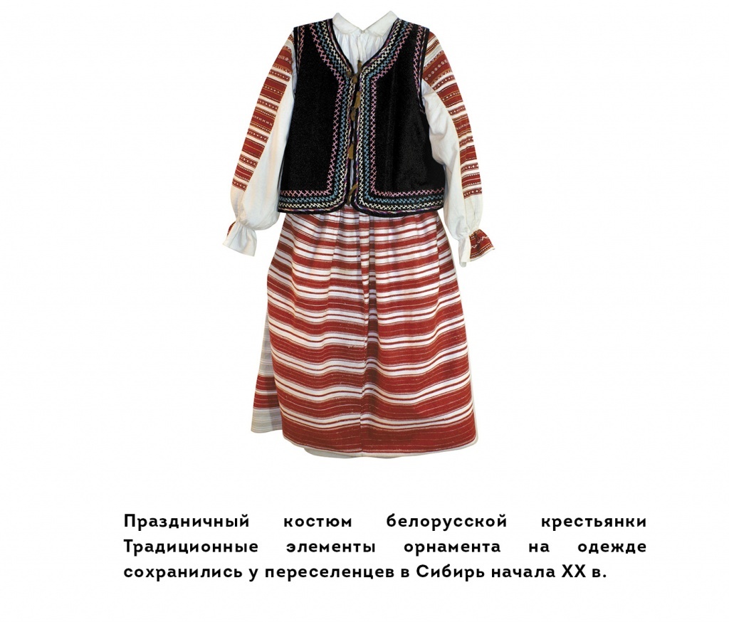 Белоруски в Сибири совсем не носили сарафаны. Обычная одежда — юбка и кофта. Юбка, особенно у пожилых женщин, делалась очень широкая и длинная. Использовали ткань в мелкую клетку. Под верхней юбкой носили нижнюю, из белого полотна. Ее вышивали по подолу и обшивали нижний срез кружевом. Девушки надевали такие юбки обычно так, чтобы чуть виднелся край кружева. Ширина традиционной юбки составляет 3 ширины ткани (юбка в три полосы). Соответственно юбки делались шириной около 180 см.