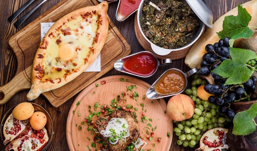 Среди мясных блюд выделяется шашлык, хинкали, сациви (кушанье из индейки или курицы в ореховом соусе). Основным алкогольным напитком, конечно же, было виноградное вино. Устойчивы традиции застольного этикета и по сей день.