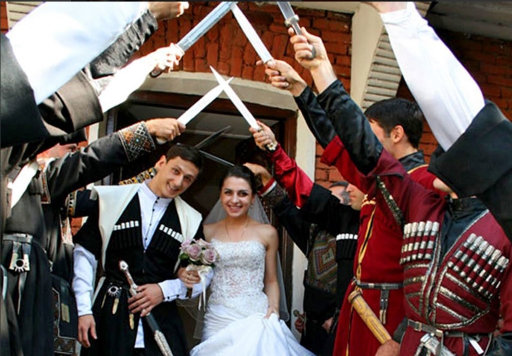 Сама свадебная церемония у грузин, помимо венчания в церкви и праздничного застолья, имеет ряд особенностей. Например, когда невеста входит в дом, где она будет жить, жених поднимается на крышу дома и выпускает на волю птицу, обязательно белого цвета.